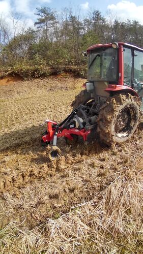サブソイラの試運転。 地下四十センチくらいのところにもぐらの穴くらいのトンネル(弾丸暗渠)を作る機械である。排水をよくするために入れる。 田んぼよりも畑の方が効果が大きいかな。